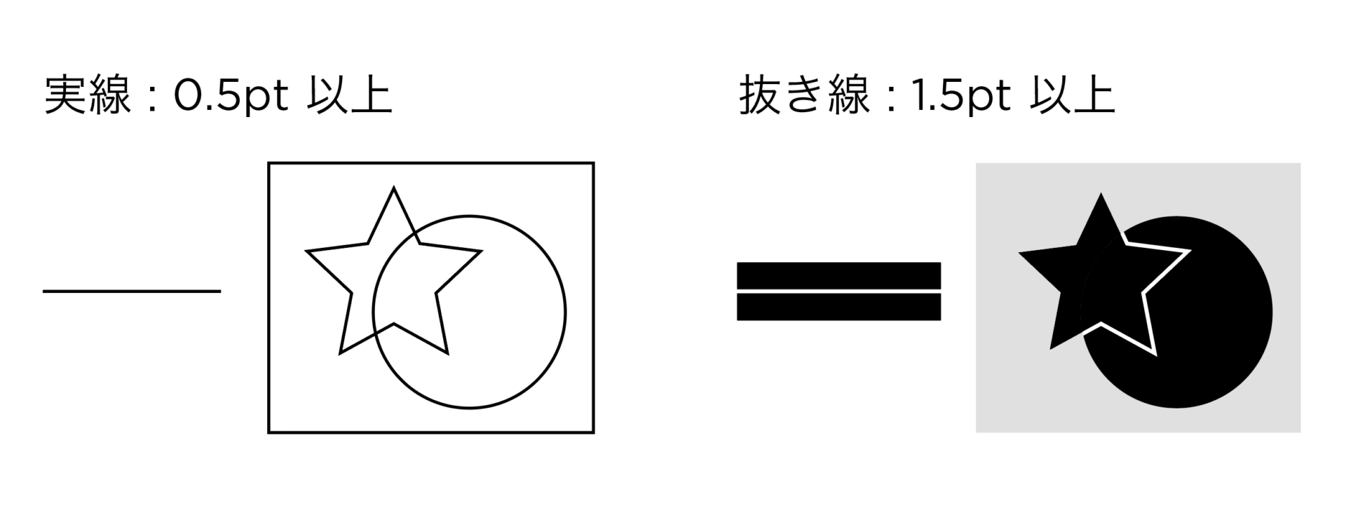 デザイン製作時には原寸サイズにて下記の太さにご注意下さい。それ以下の太さは、潰れやカスレ / 正確に表現できない場合があります。