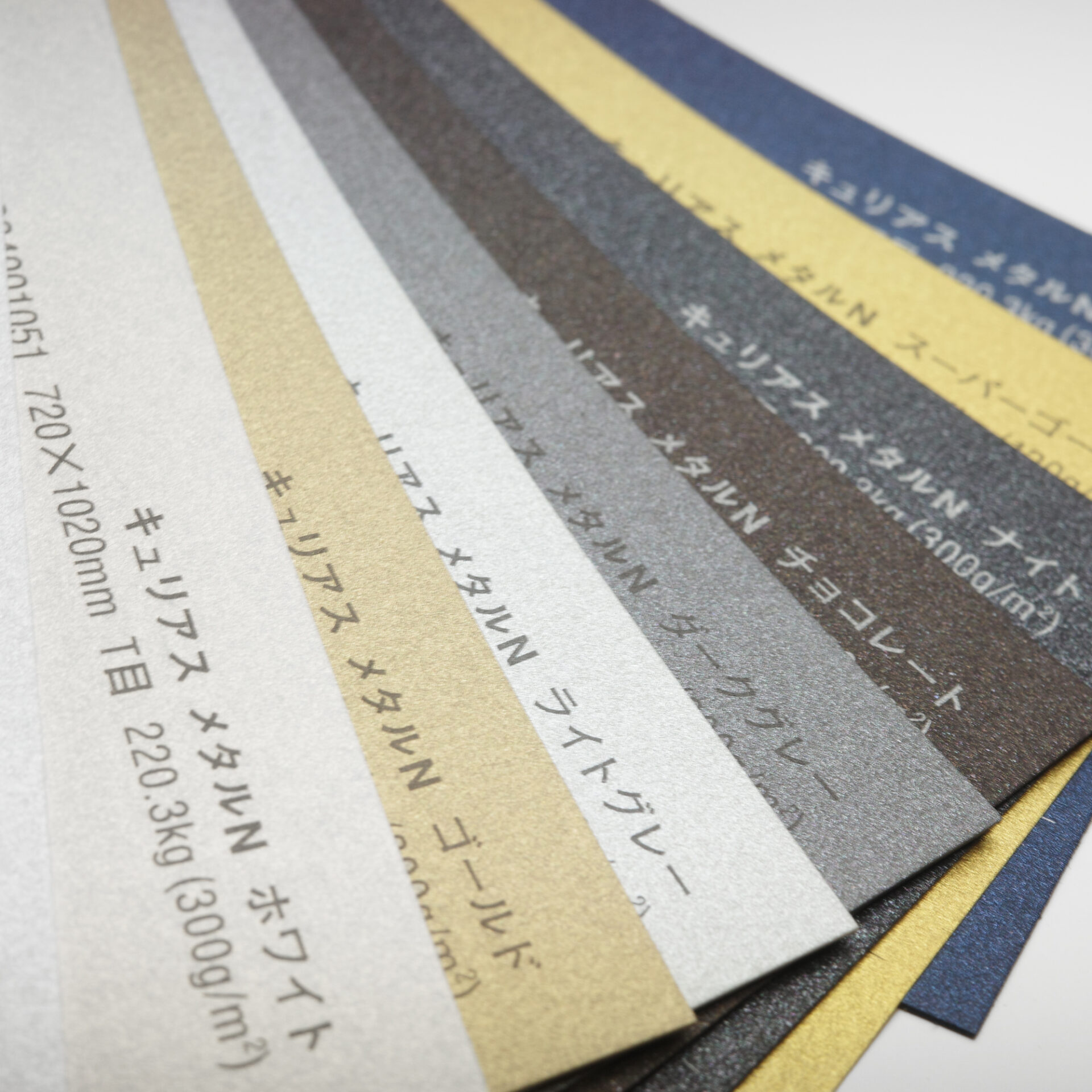金属を思わせるような輝きが特長の両面パール紙です。メタリックで深みのある色合いと指先に心地良い質感で、通常の紙ではできない演出が可能です。